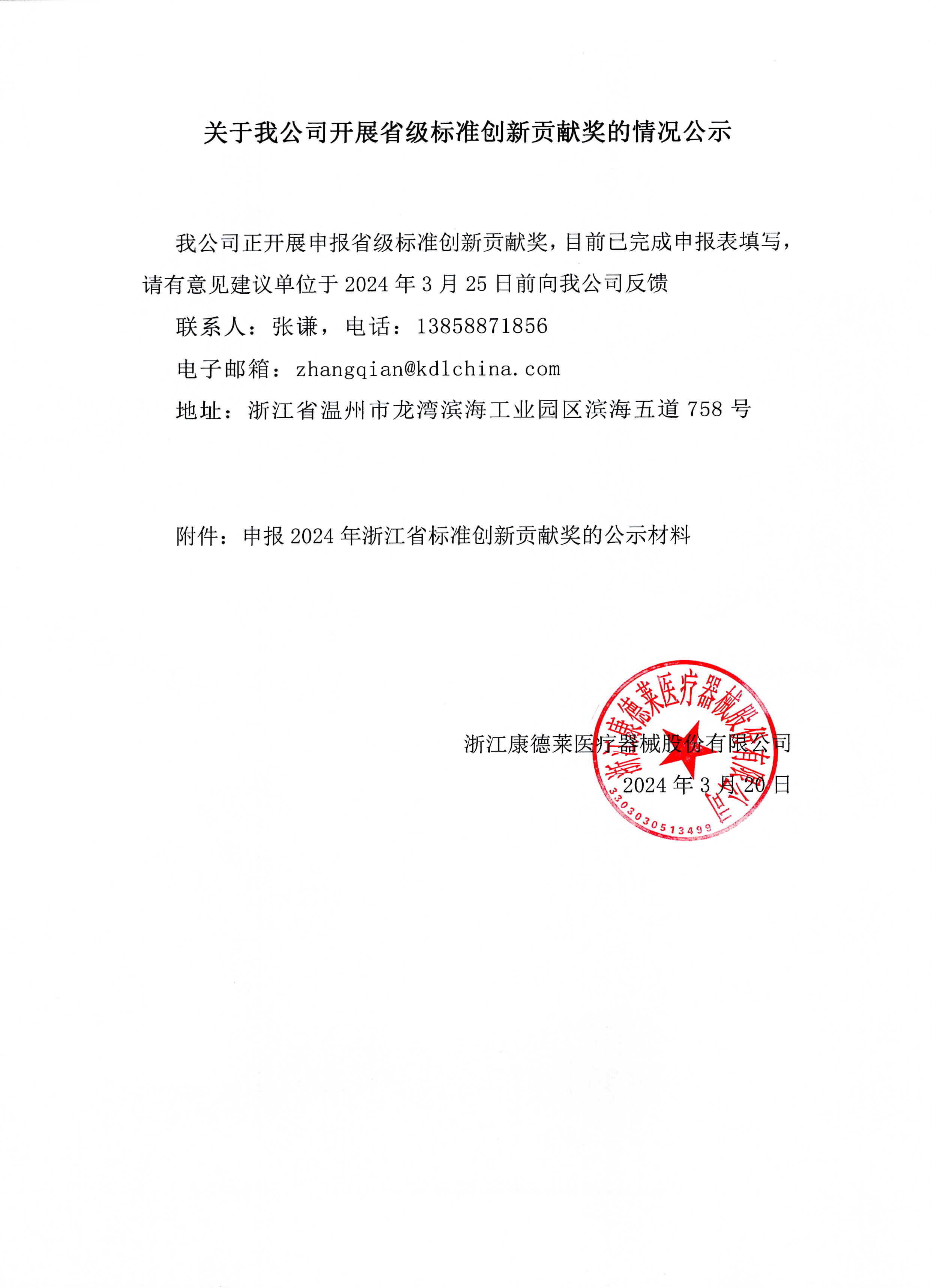 关于我公司开展温州市标准创新贡献奖的情况公示